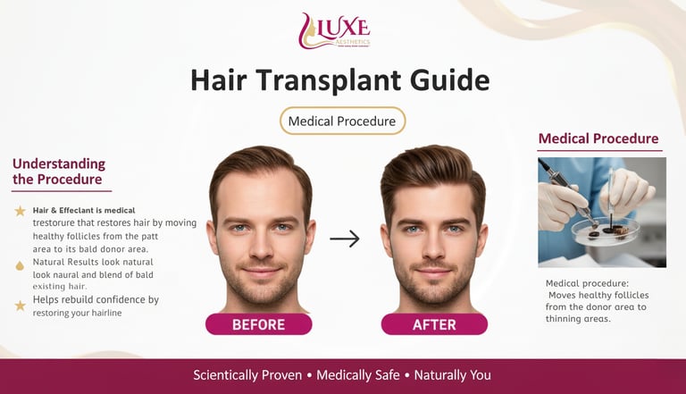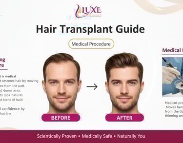 At Luxe Aesthetics, we specialize in natural-looking hair transplants that help you regain a fuller, youthful hairline. Using advanced techniques such as FUE (Follicular Unit Extraction) and DHI (Direct Hair Implantation), our expert surgeons ensure maximum graft survival, minimal downtime, and lifelong results.
