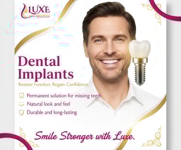 A missing tooth can affect not only your appearance but also your ability to chew, speak, and smile with confidence. At Luxe Aesthetics Islamabad, our Dental Implant treatment offers a permanent, natural-looking solution for missing teeth — restoring both function and beauty.